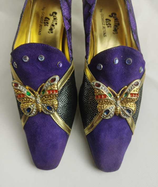 Bogato zdobione wstawki z kryształków i broszek w kształcie motyla.