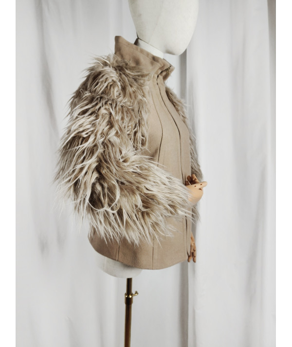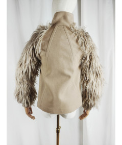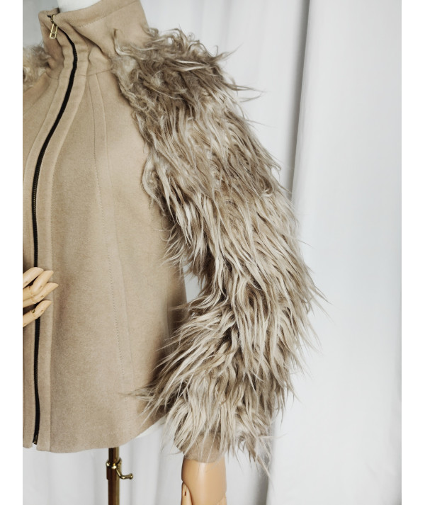 Oryginalna kurtka wełniana z futrzanymi syntetycznymi, efektywnymi rękawami.