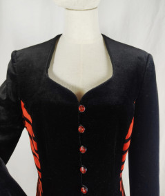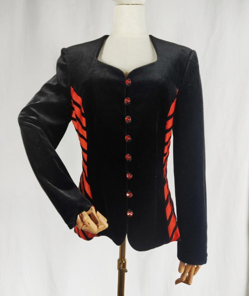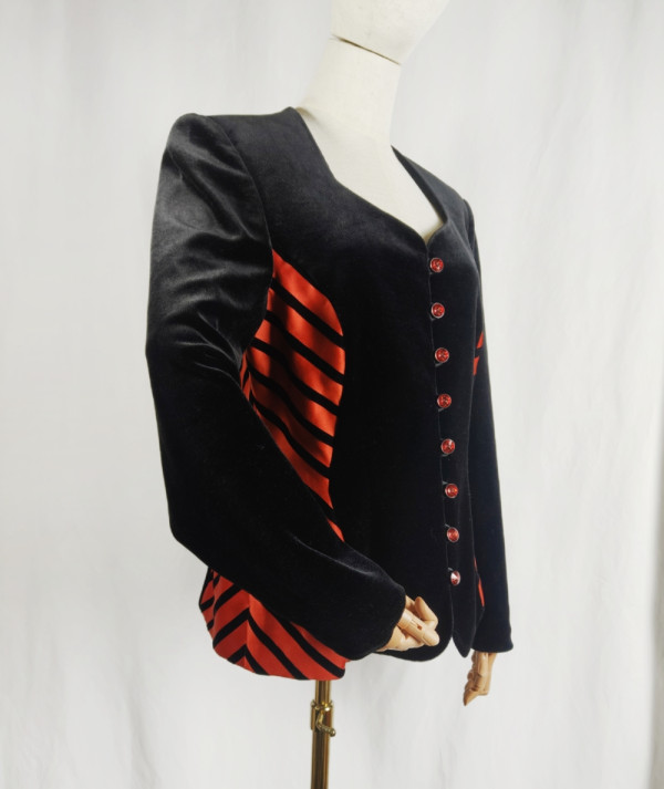 Zapinana na zdobione guziki w kolorze wstawek po bokach.